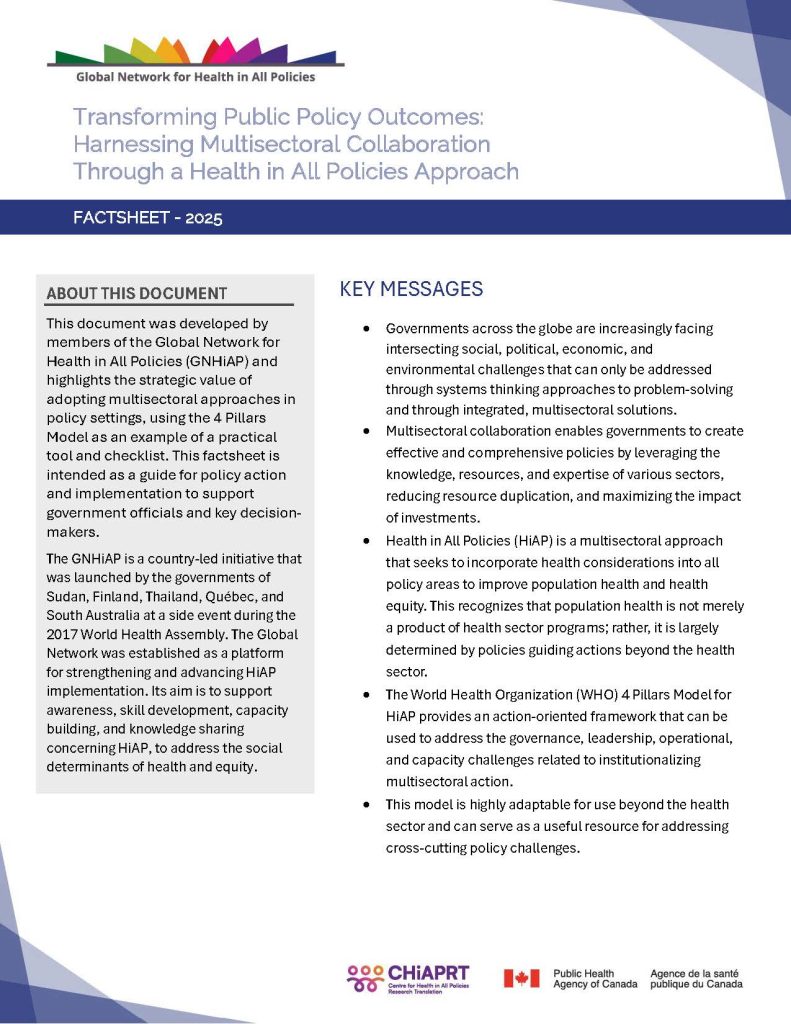Each factsheet, developed by members of the Global Network for Health in All Policies, is tailored to a specific audience and highlights practical ways to support intersectoral action. Designed for a wide range of users, including policymakers, public health professionals, civil society organizations, and international partners, the series showcases diverse entry points and strategies for embedding health into policy processes.